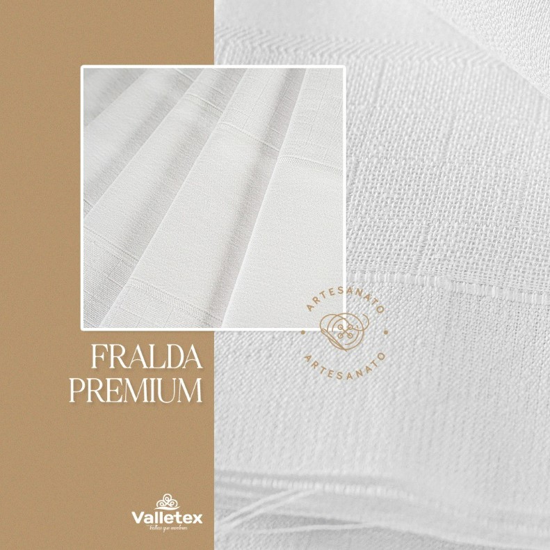 A fralda de boca Premium da Valletex é confeccionada em tecido duplo, 100% algodão, com gramatura de 175 g/m², o que proporciona conforto e maciez para a pele do bebê.
